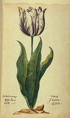 As the flowers grew in popularity, professional growers paid higher and higher prices for bulbs with the virus, and prices rose steadily. By 1634, in part as a result of demand from the French, speculators began to enter the market.[25] The contract price of rare bulbs continued to rise throughout 1636, but by November, the price of common, “unbroken” bulbs also began to increase, so that soon any tulip bulb could soon fetch hundreds of guilders. That year the Dutch created a type of formal futures marketswhere contracts to buy bulbs at the end of the season were bought and sold. Traders met in “colleges” at taverns and buyers were required to pay a 2.5% “wine money” fee, up to a maximum of three guilders per trade.![]()