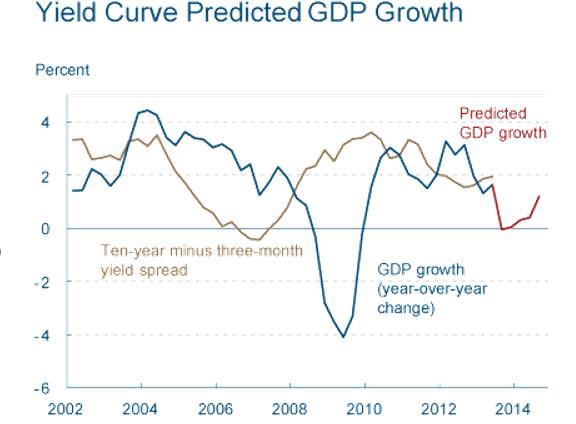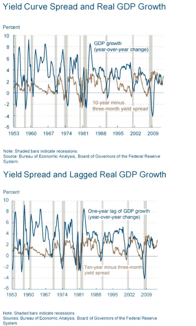 More generally, a flat curve indicates weak growth, and conversely, a steep curve indicates strong growth. One measure of slope, the spread between ten-year Treasury bonds and three-month Treasury bills, bears out this relation, particularly when real GDP growth is lagged a year to line up growth with the spread that predicts it.