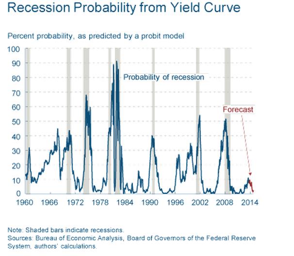 While we can use the yield curve to predict whether future GDP growth will be above or below average, it does not do so well in predicting an actual number, especially in the case of recessions. Alternatively, we can employ features of the yield curve to predict whether or not the economy will be in a recession at a given point in the future. Typically, we calculate and post the probability of recession one year forward.