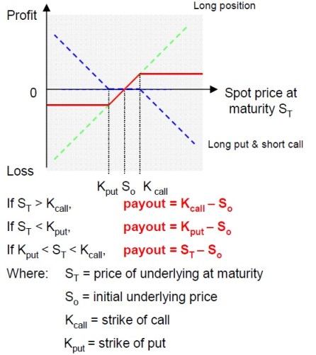 - Investor uses the premium received from sale of a call to finance the purchase of a put at higher strike. This strategy is combined to give a structure whose payoff resembles thet of long call-spread.